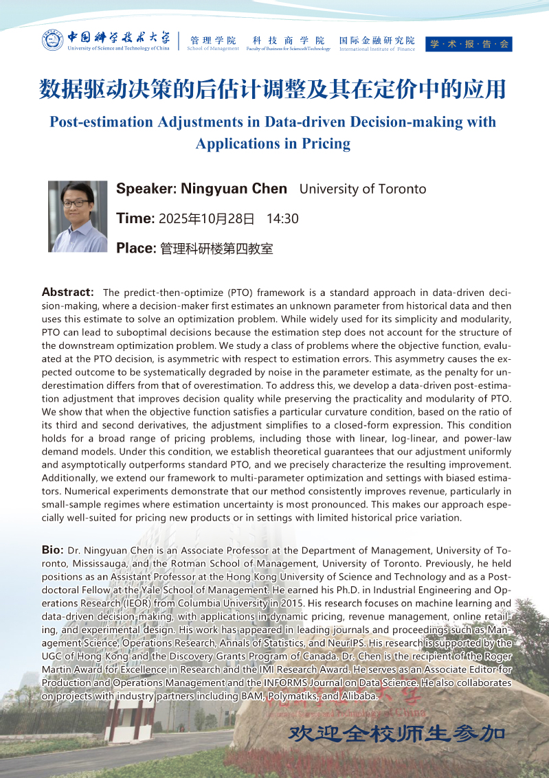 学术报告会 | 数据驱动决策的后估计调整及其在定价中的应用