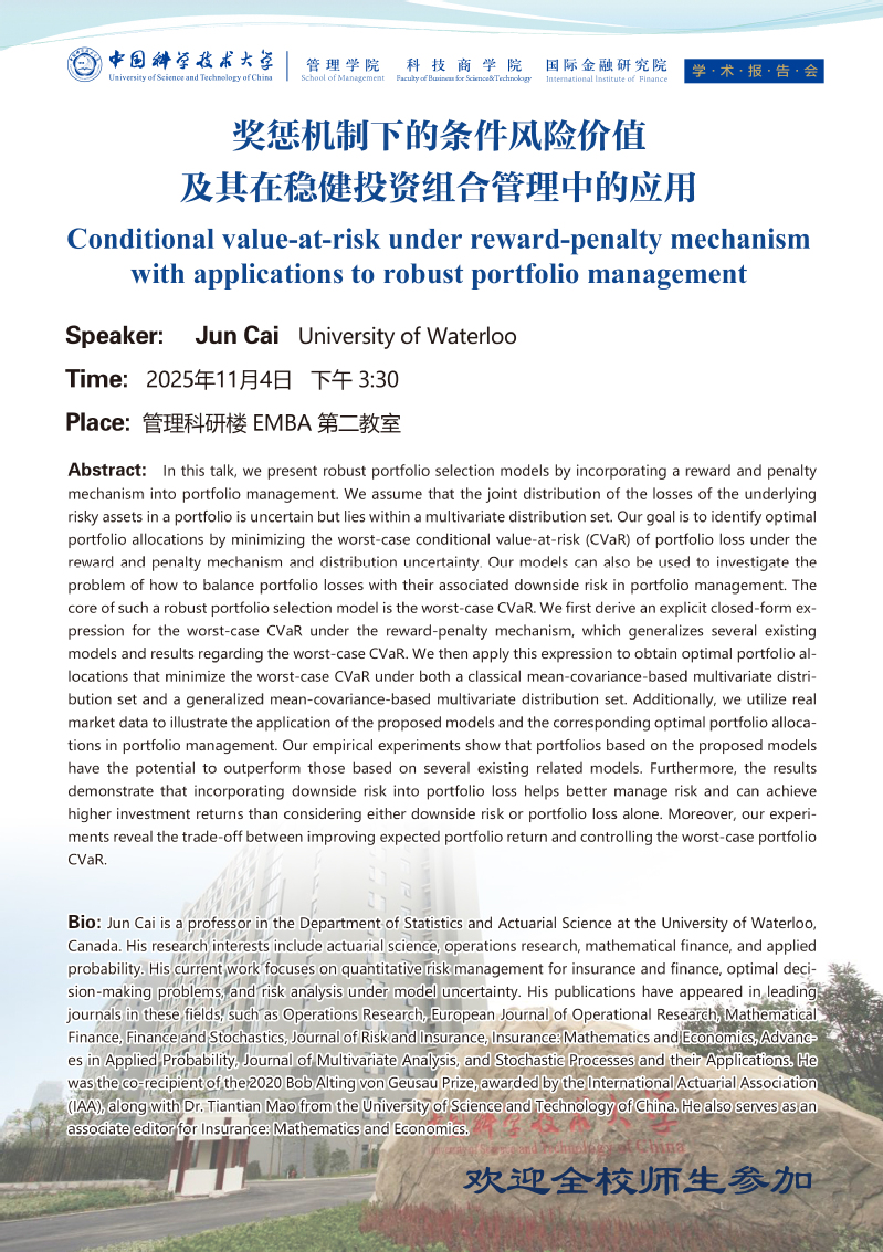 学术报告会 | 奖惩机制下的条件风险价值及其在稳健投资组合管理中的应用