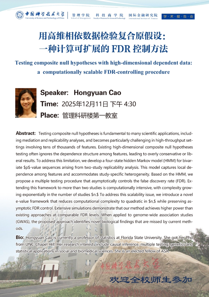 学术报告会 | 用高维相依数据检验复合原假设:一种计算可拓展的FDR控制方法