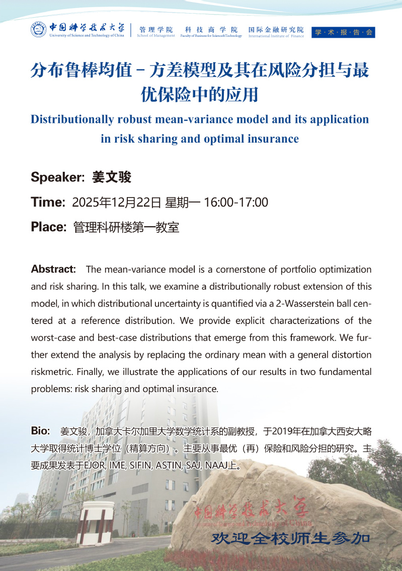 学术报告会 | 分布鲁棒均值-方差模型及其在风险分担与最优保险中的应用