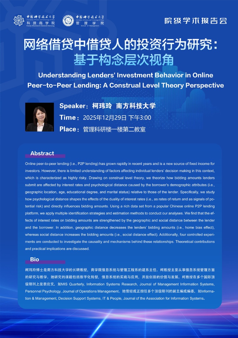 学术报告会 | 网络借贷中借贷人的投资行为研究:基于构念层次视角