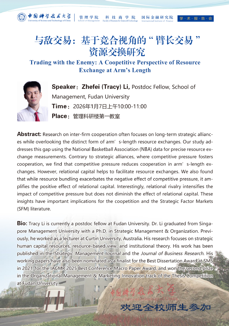 学术报告会 | 与敌交易:基于竞合视角的“臂长交易”资源交换研究
