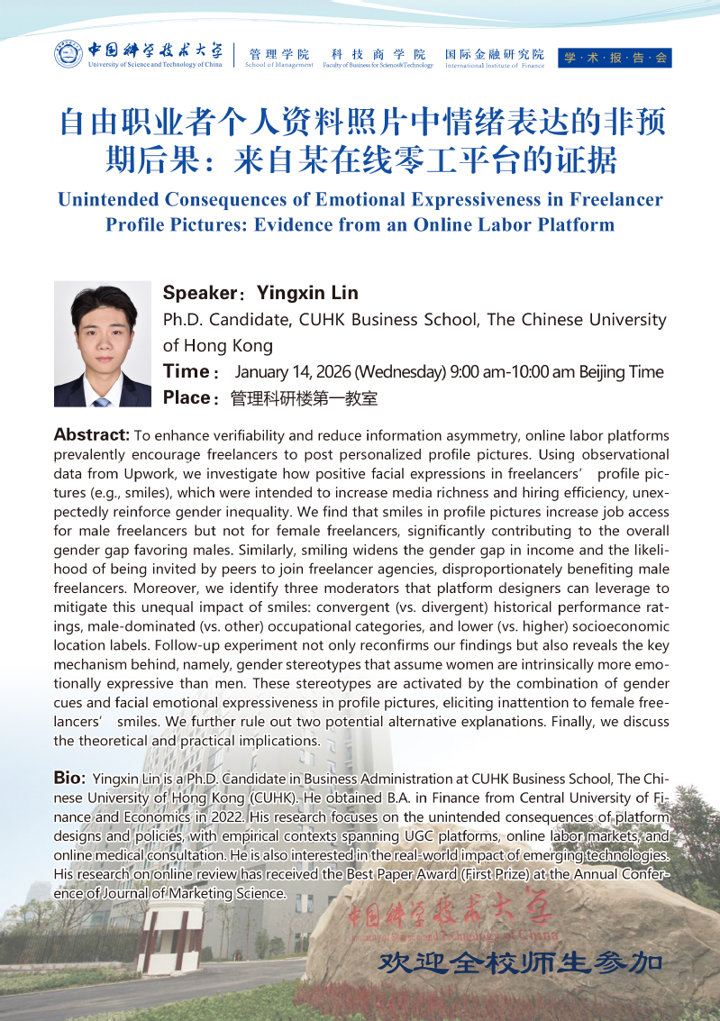 学术报告会 | 自由职业者个人资料照片中情绪表达的非预期后果:来自某在线零工平台的证据