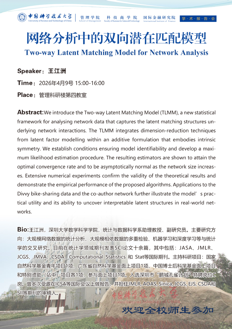学术报告会 | 网络分析中的双向潜在匹配模型