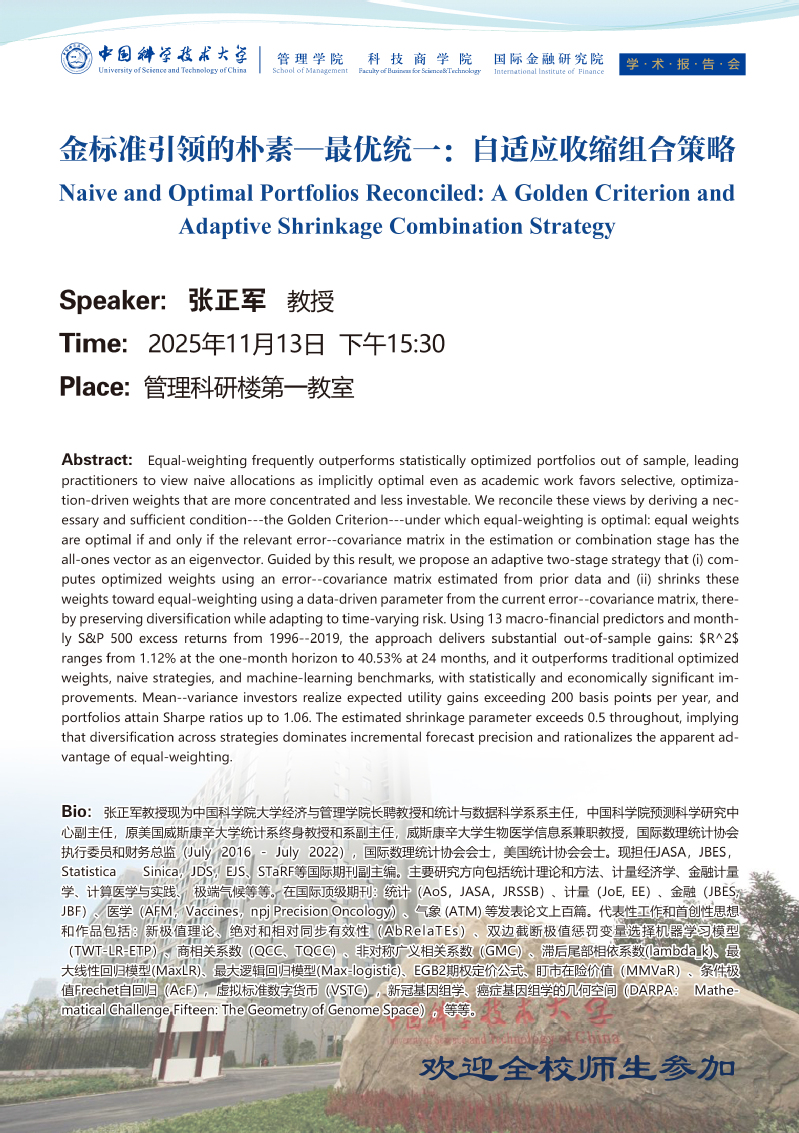 学术报告会 | 金标准引领的朴素——最优统一:自适应收缩组合策略