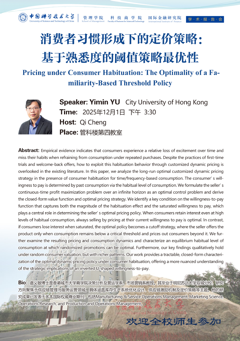 学术报告会 | 消费者习惯形成下的定价策略:基于熟悉度的阈值策略最优性