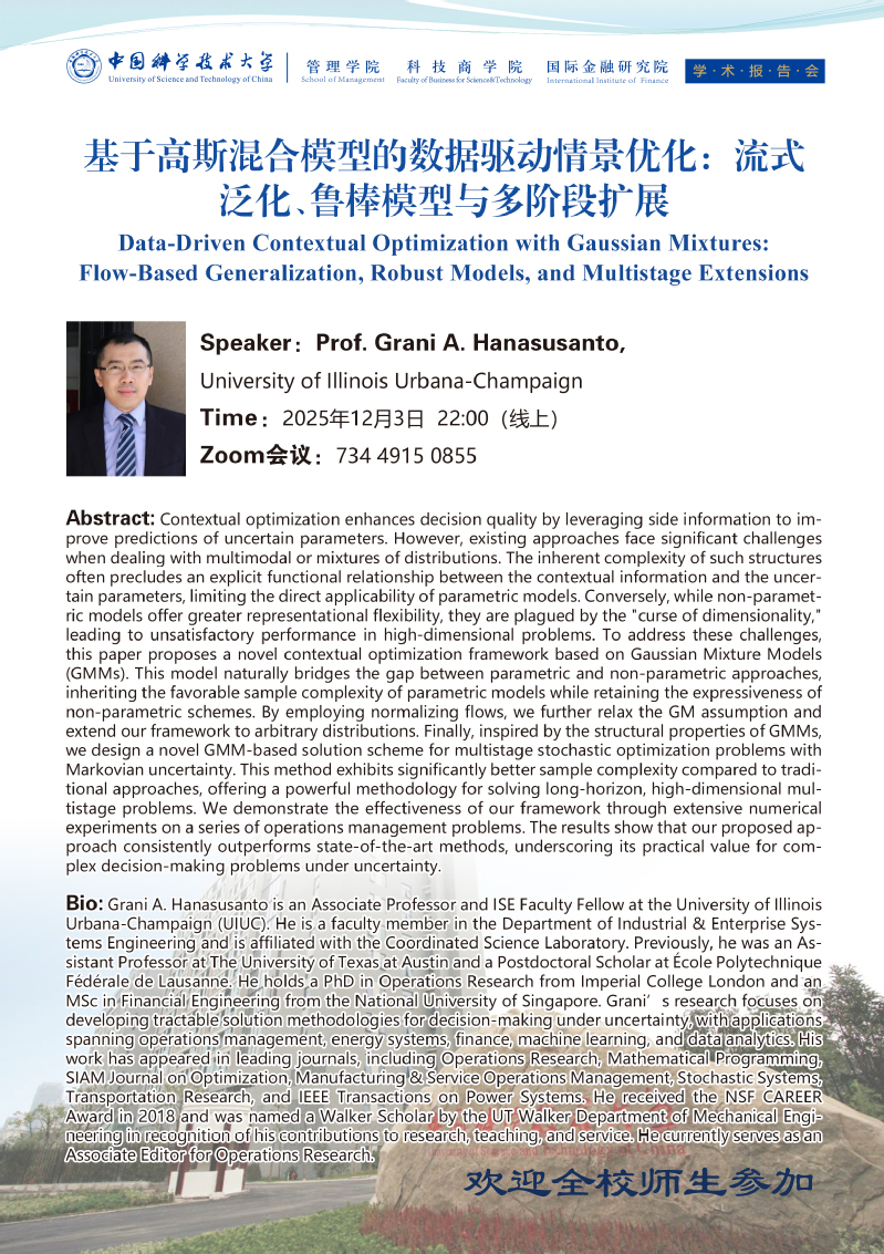 学术报告会 | 基于高斯混合模型的数据驱动情景优化:流式泛化、鲁棒模型与多阶段扩展