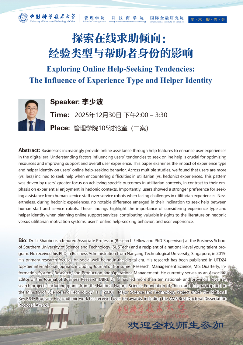 学术报告会 | 探索在线求助倾向:经验类型与帮助者身份的影响