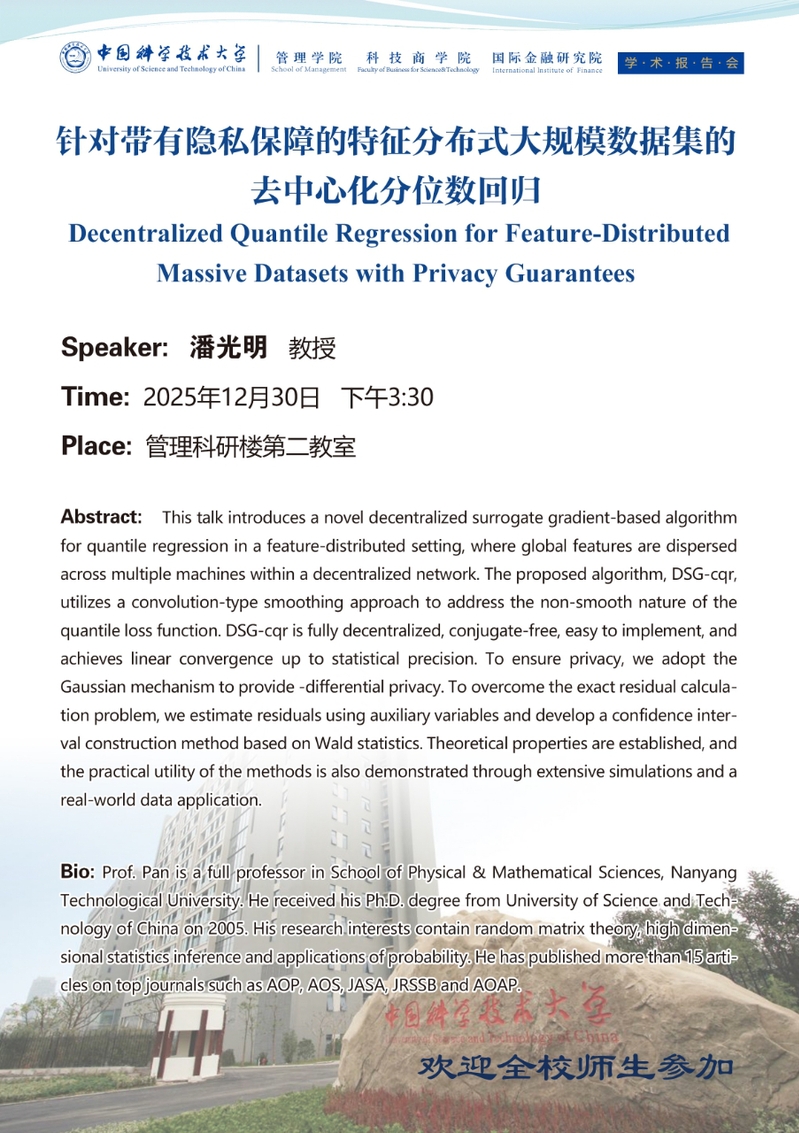 学术报告会 | 针对带有隐私保障的特征分布式大规模数据集的去中心化分位数回归