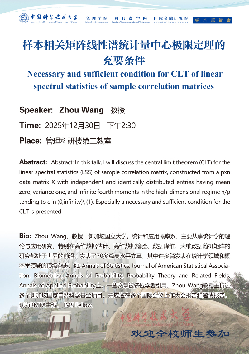 学术报告会 | 样本相关矩阵线性谱统计量中心极限定理的充要条件
