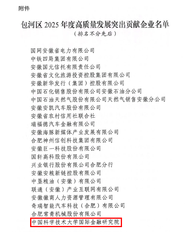 2026 年,国金院将以此荣誉为新起点,持续发挥校地协同创新平台优势,聚焦科技金融等重点方向,全力服务合肥市与包河区产业提升与高质量发展大局,为区域经济社会发展、为加快建设现代化美好安徽贡献更多科大智慧与科大力量。