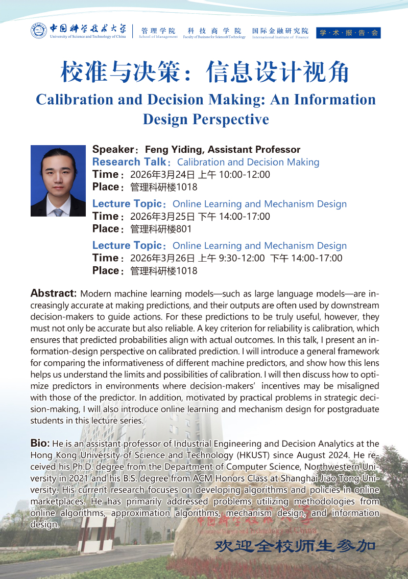 报告人:Feng Yiding,Assistant Professor时间:2026年3月24日上午10:00;2026年3月25日下午14:00;2026年3月26日上午9:30,下午14:00地点:管理科研楼1018