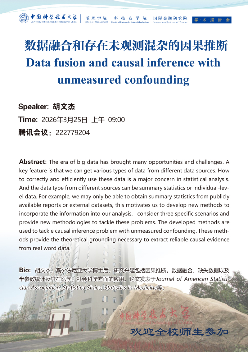 学术报告会 | 数据融合和存在未观测混杂的因果推断